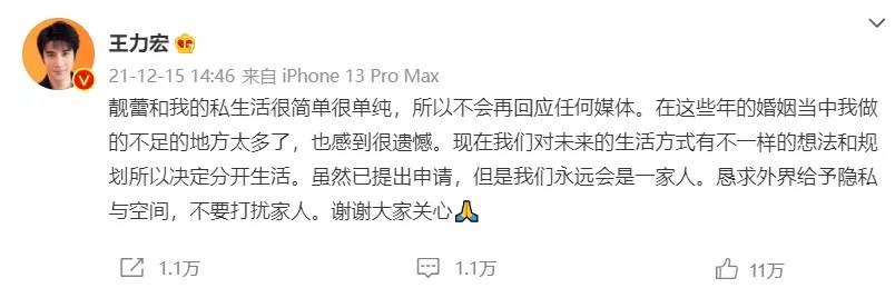 在反復傳言多次否認之後,王力宏突然發文承認離婚,表示已經提出申請,但跟前妻永遠會是一家人,也感謝了大家關心。